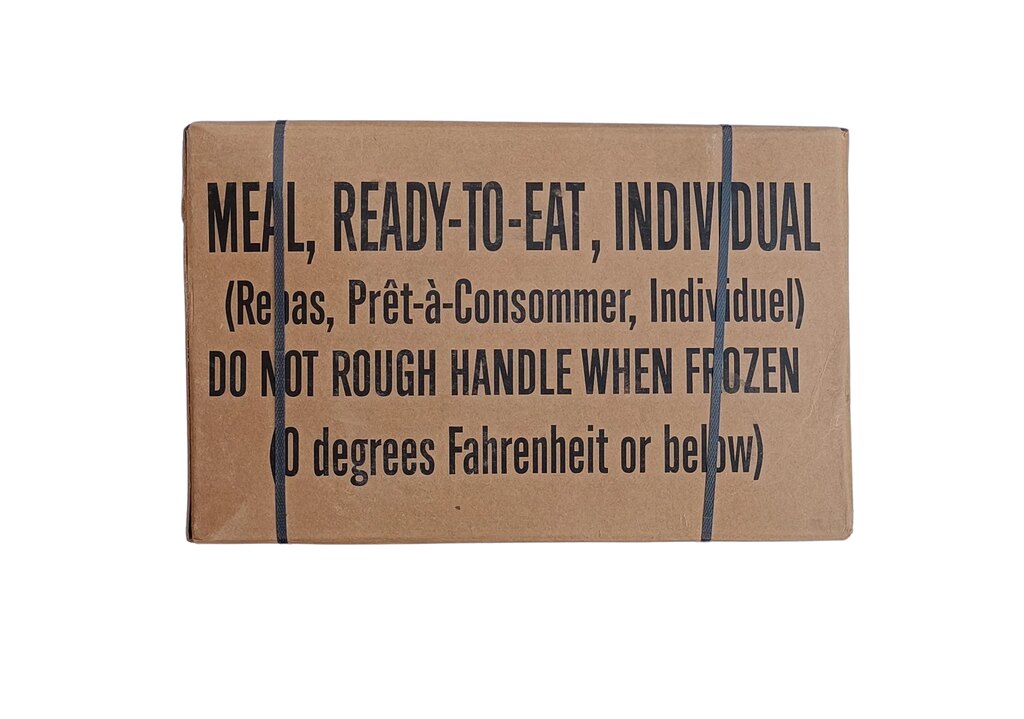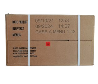 | Součástí dodávky | Baleno v papírové krabici napuštěné směsí, která má odpuzovat hlodavce Krabice by měla být odolná proti plísni (funkčnost nezaručena - neověřeno) Obsahuje 12 menu Každé menu obsahuje: Hlavní jídlo Sůl a pepř Příloha / snack - chléb, tortilla apod. Máslo / pomazánka Krekry / sušenky Dezert / sladkost Nápoj (nápojový prášek) 1× plastová lžíce Bezplamenný ohřívač jídla aktivovaný vodou (NSN 8970-01-321-9153) Ubrousek a další doplňky |