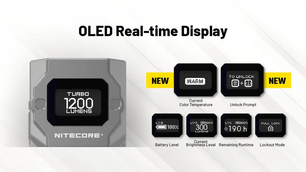Integrovaný OLED displej ukazuje vše podstatné v reálném čase – od zvoleného režimu přes stav baterie až po odhad výdrže. Nitecore TUP2 tak eliminuje dohady a umožňuje rychle reagovat na měnící se podmínky. Displej zjednodušuje ovládání a přidává jistotu, že svítilna běží přesně tak, jak má.