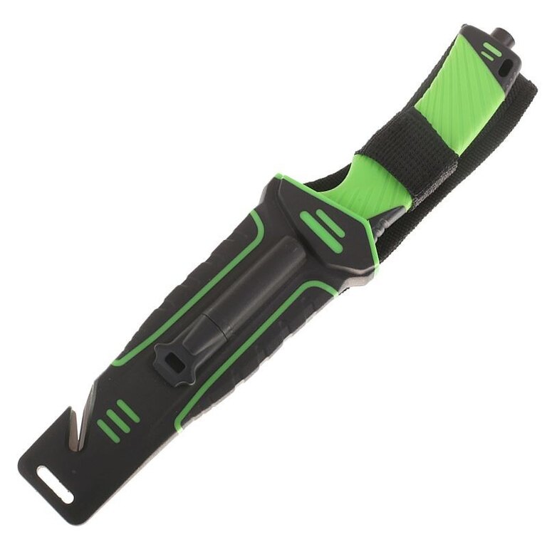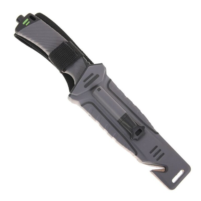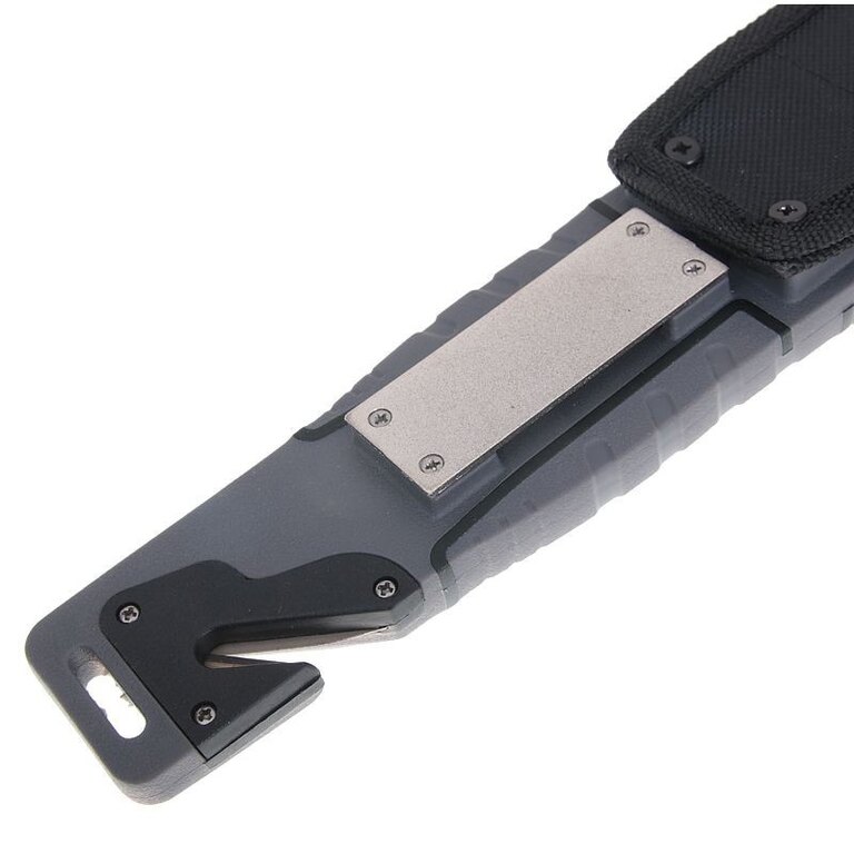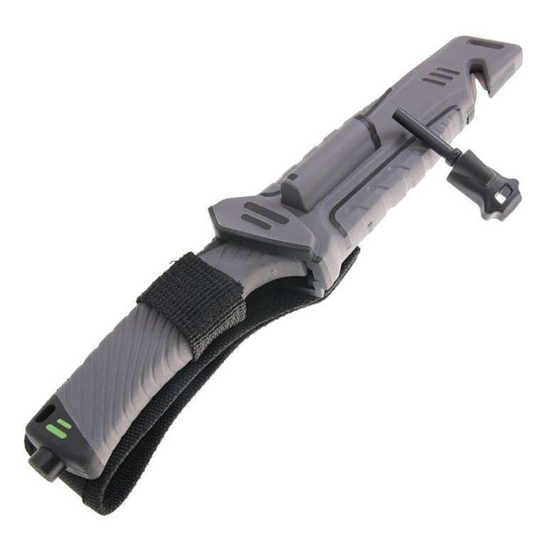 Profilovaná rukojeť z odolného ABS plastu je opatřena protiskluzovou texturou a zaručuje pohodlný a jistý úchop. Na jejím konci najdete otvor pro závěsnou šňůrku a tvrzený hrot pro rozbíjení skla v nouzových situacích. Skutečnost, že rukojeť lze celou z nože odejmout přispívá ke snadnému čištění nože.