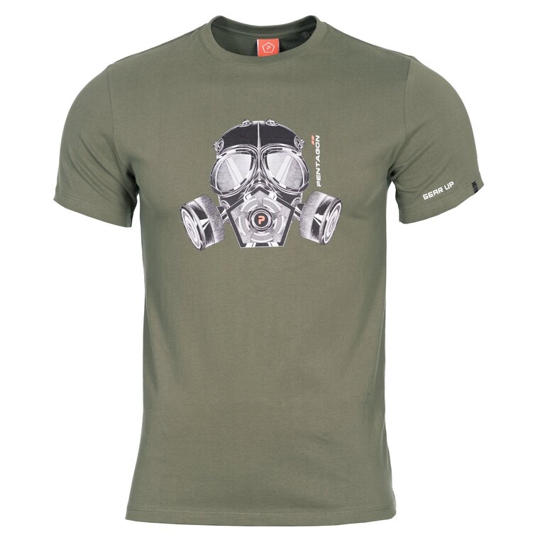 Toto triko Pentagon přináší uživateli prvotřídní kvalitu, je příjemné na dotyk a při nošení dodává až sametový pocit. Krátké rukávy a klasický kulatý výstřih pak triko předurčují pro nošení v teplých až horkých dnech. Na přední straně na prsou má tričko natištěný velký motiv – plynovou masku.