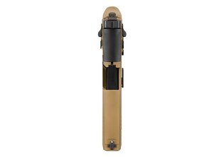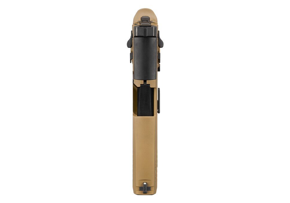 disponuje manuální pojistkou a záchytem závěru přístupným z obou stran, a záchyt zásobníku je možné přehodit pro praváky i leváky. Tato oboustranná konfigurace zvyšuje komfort i bezpečnost obsluhy v provozu. Ovládací prvky mají černé provedení v kontrastu s pískovým rámem, což udržuje přehlednost ovládání.